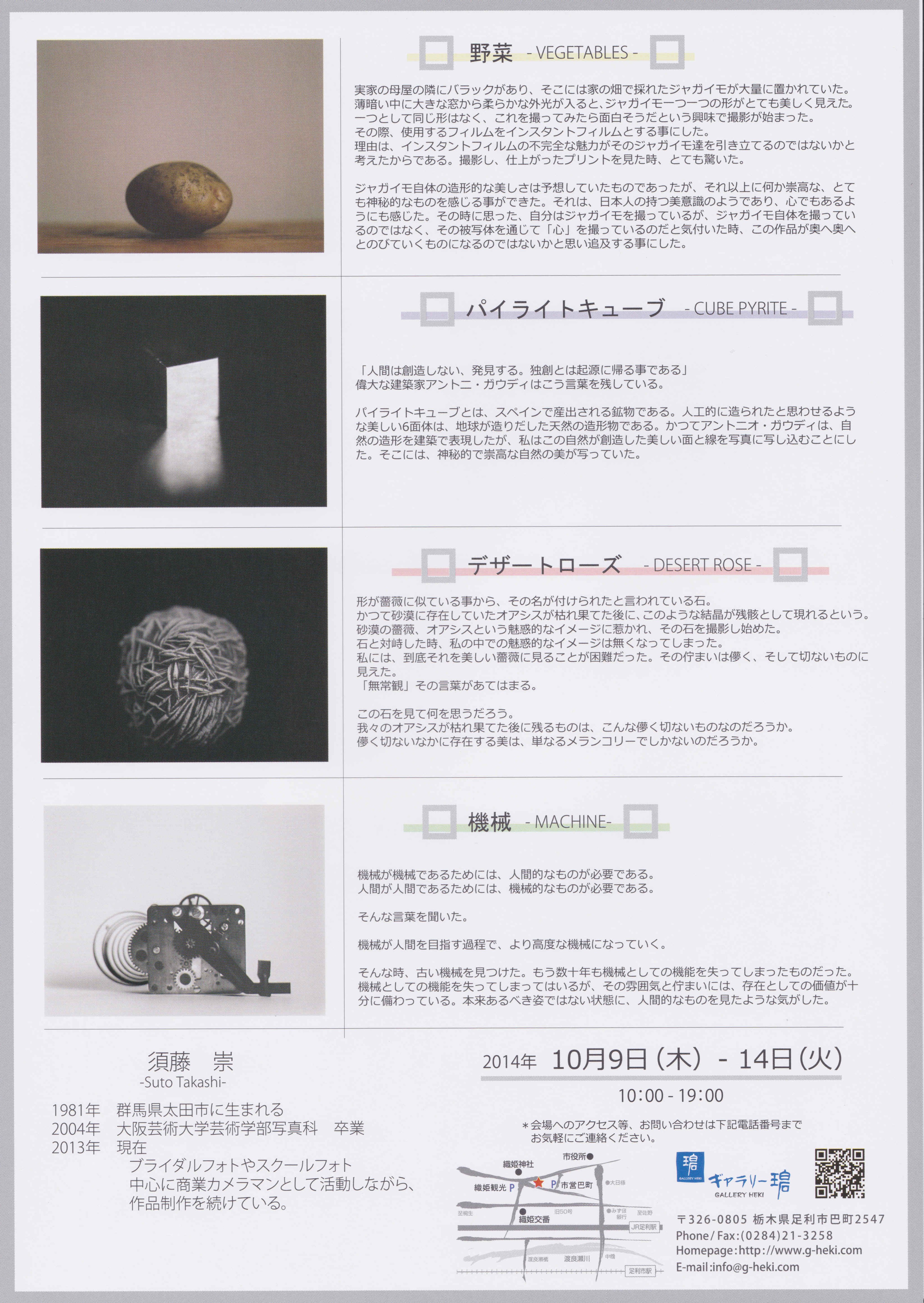 いよいよ開始 須藤崇 写真展 投稿日: 2014年10月7日 投稿者: gheki いよいよ、今週木曜日から「須藤崇 写真展」が開催になります。 早速、展示風景をお伝えします。 作品の素晴らしさは会場風景だけでは伝わらないと思いますので、 ぜひ、実際に足を運んでみてみてください。 スライドショーには JavaScript が必要です。 「須藤崇 写真展」 2014年 10月9日~14日 10:00-19:00 会場へのアクセス、駐車場や作品に対する問い合わせは、お気軽にお電話ください。 TEL:0284-21-3258 Facebook で共有するにはクリックしてください (新しいウィンドウで開きます) Facebook
